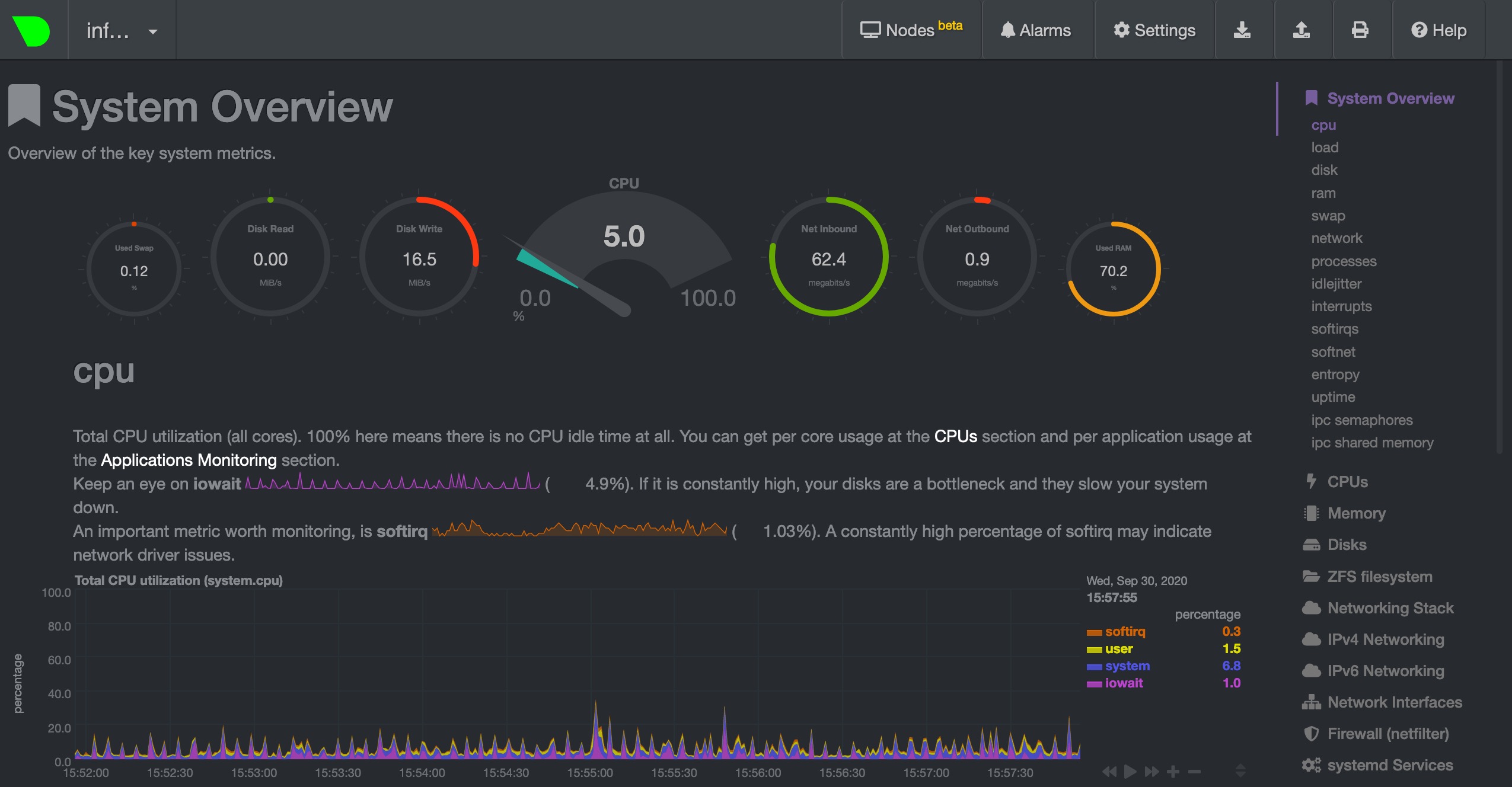 首先我安装了 Netdata,这是一个开箱即用的监控工具,在仅占用少量资源的情况下提供秒级精度的大量统计指标,非常适合用于监控单台服务器的性能瓶颈。