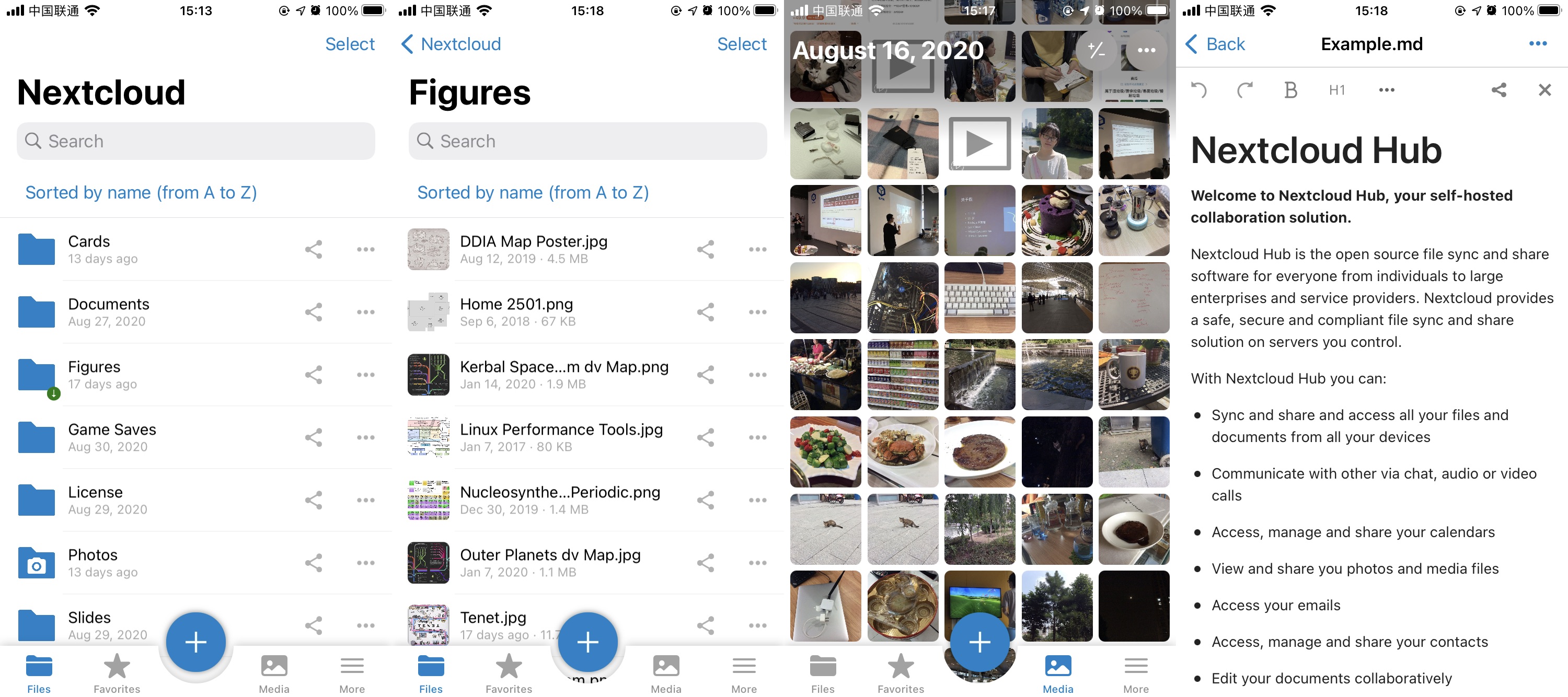 其中最重要的一个应用是 NextCloud,这是一个开源的同步盘,我主要看中它的 iOS 应用和 iOS 有不错的整合,可以正确地同步 Live Photo,也可以在 iOS 的文件应用中被调用。